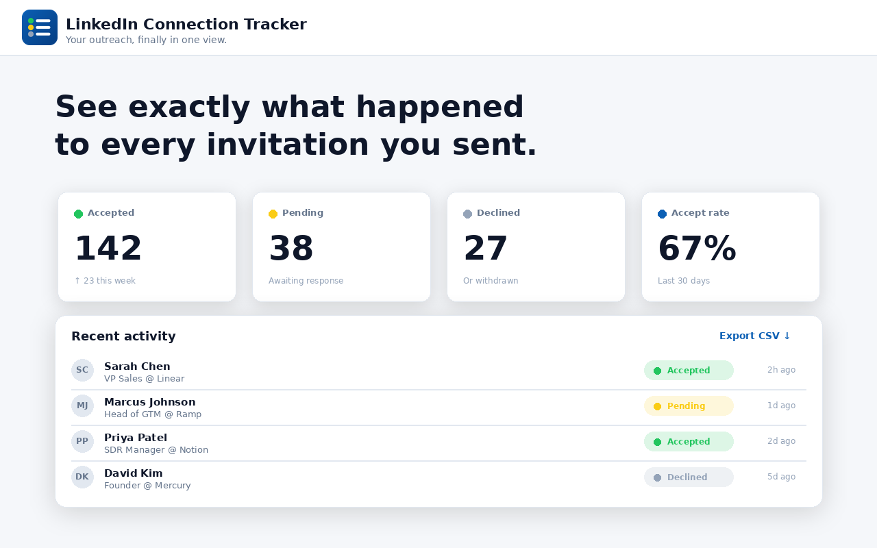 See who accepted, who’s pending, who declined, all in one place. Tracked automatically while you use LinkedIn. No spreadsheet to keep, no CRM tab to update.